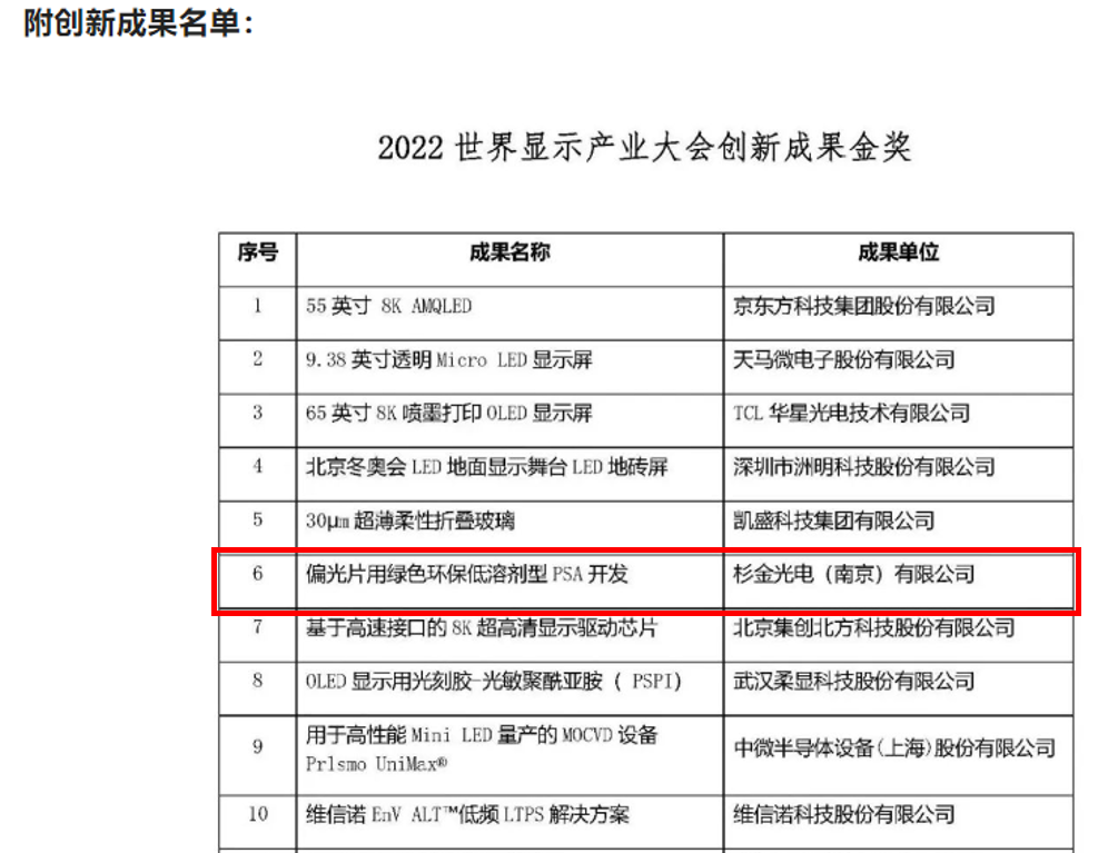 經(jīng)中國光學光電子行業(yè)協(xié)會液晶分會、國際信息顯示學會(中國區(qū))、中國半導體行業(yè)協(xié)會、中國電子視像行業(yè)協(xié)會、中國電子材料行業(yè)協(xié)會、中國電子專用設(shè)備工業(yè)協(xié)會、中國OLED產(chǎn)業(yè)聯(lián)盟、世界超高清視頻產(chǎn)業(yè)聯(lián)盟、虛擬現(xiàn)實產(chǎn)業(yè)聯(lián)盟等9家國內(nèi)外重點行業(yè)機構(gòu)及大會組委會辦公室推薦,專家委員會綜合技術(shù)領(lǐng)先性、市場競爭性、應用體驗性,推選出2022世界顯示產(chǎn)業(yè)大會創(chuàng)新成果金獎15項,優(yōu)秀獎30項。其中,杉金光電綠色環(huán)保低溶劑型PSA榮獲2022世界顯示產(chǎn)業(yè)大會創(chuàng)新成果金獎。